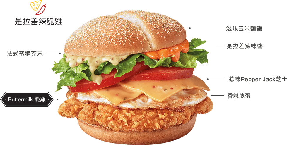 是拉差辣味醬與法式蜜糖芥末配搭起來,酸酸甜甜,非常醒胃。Buttermilk脆雞,嫩滑多汁,加上惹味的金黃煎蛋和Pepper Jack芝士,一起夾在玉米麵飽內,各種鮮明的味道平衡得宜,撞出最有特色的泰式滋味﹗