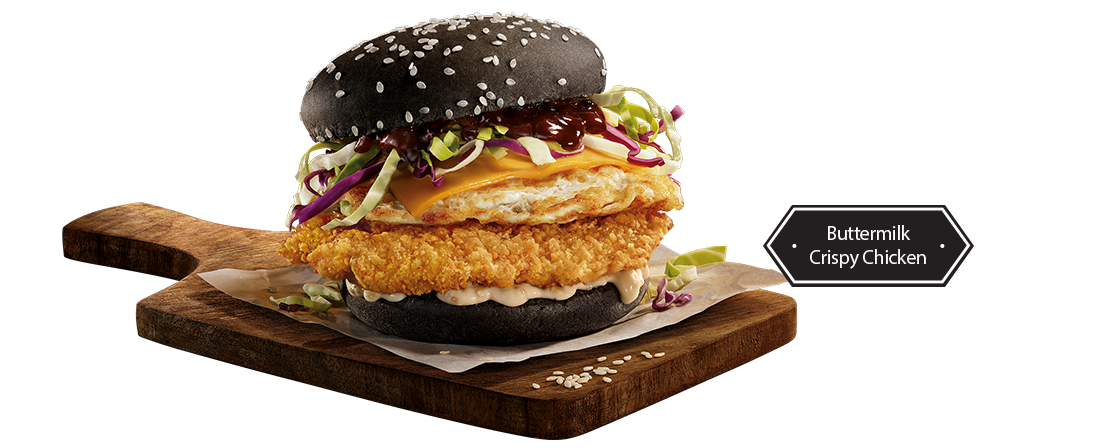 The tender and juicy buttermilk crispy chicken, mixed with some nice traditional tonkatsu sauce, fried egg and cabbage. Together with the stunning black bun, all combined to form a rich Tokyo taste with a wonderfully unique look, texture and taste.
